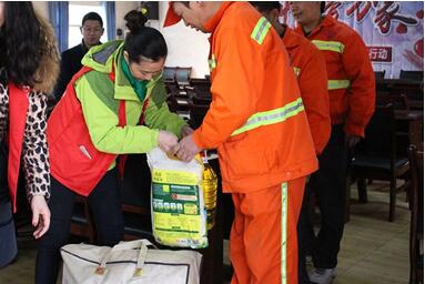 随后,彭广文常务副会长和帅卒领队以及志愿者们向环卫工人一一分发新春慰问品,每位环卫工人都领到一件床上四件套、一床被子、一袋米、一桶油,虽然慰问品